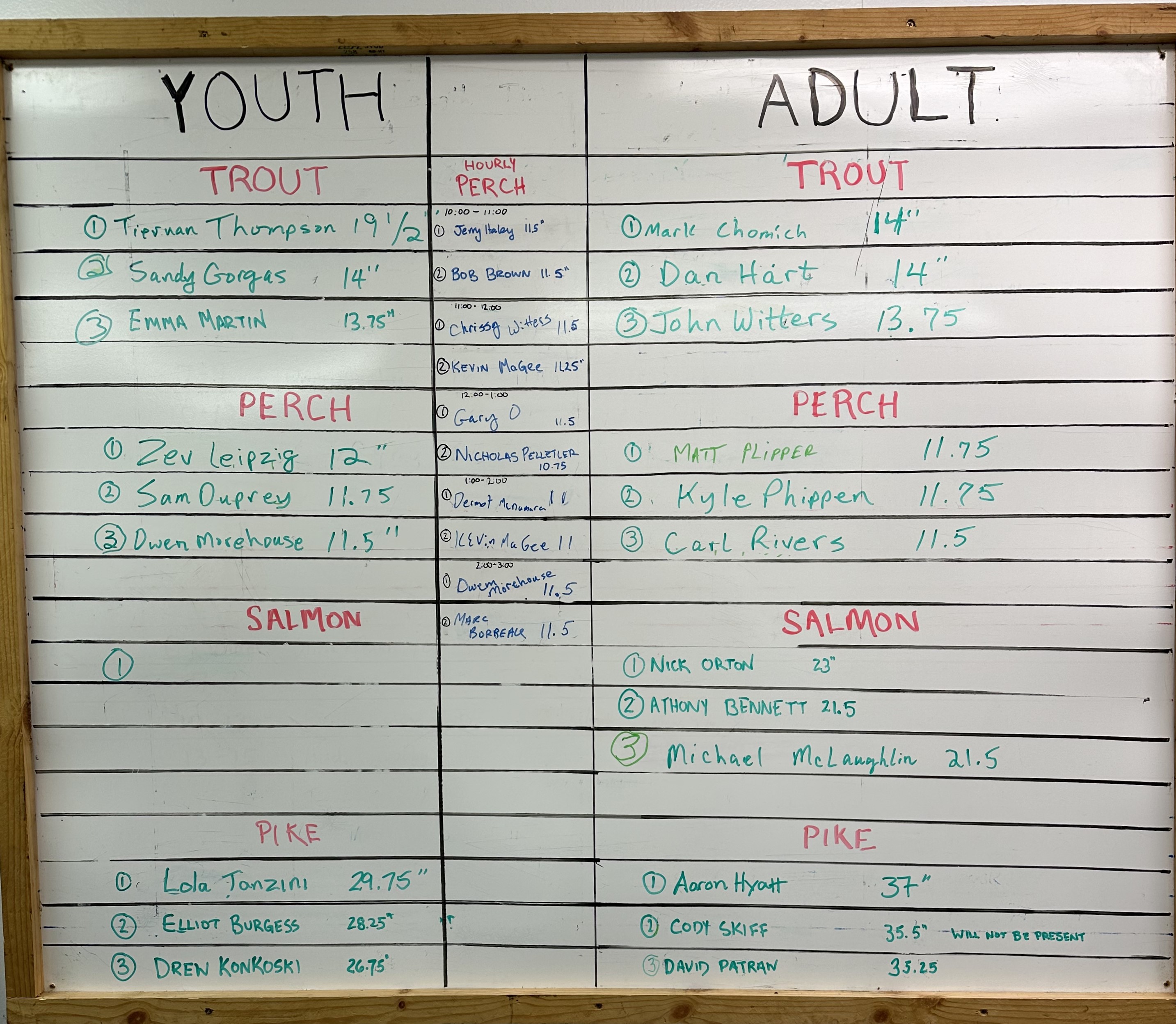 9. Prizes will be awarded to the top three heaviest fish in the Perch, Trout & Salmon categories, & the three longest fish in the Pike category. In the case of a tie, the winner will be the first fish entered.